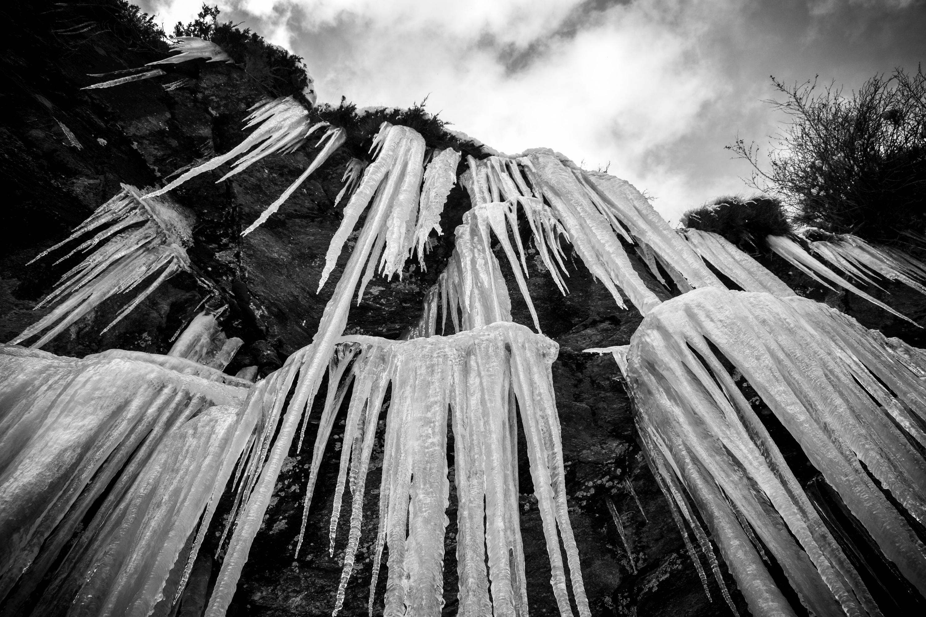 Ein faszinierendes Diamantglasbild der Eisbehänge am Berg, das die filigranen Eiskristalle und die imposante Kraft der Natur in beeindruckender Klarheit und Tiefe zeigt. Ein einzigartiges Kunstwerk für Liebhaber alpiner Schönheit.